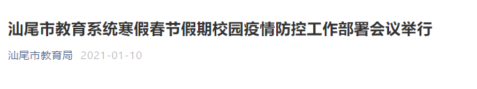 1月10日,汕尾市教育系统寒假春节假期校园疫情防控工作部署会议举行。会上明确,学校要错峰放假和开学,防止人传人、物传人、环境传人,加强安全教育和家长互通,要求加强个人防护,提倡全市教育系统干部职工、教师、学生非特殊情况不得离汕,要求离开本市严格审批。要严格实施健康监测。要求全市教育系统干部职工、教师、学生每日进行线上健康打卡,确保健康监测做到全覆盖、无遗漏,做到不瞒报、谎报、缓报、漏报。