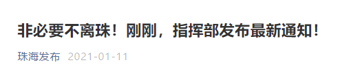 珠海市新型冠状病毒肺炎疫情防控指挥部发布《关于做好2021年春节期间疫情防控工作的通知》。《通知》提出,中小学生和托幼机构儿童以及教职员工,提倡在珠过寒假;各单位一律取消集体团拜和大型慰问、联欢、聚餐、培训等活动。