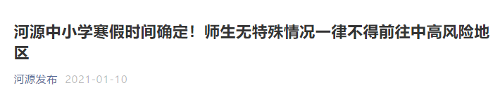 日前,河源市教育局发布《关于做好2020-2021学年寒假有关工作的通知》,明确义务教育阶段学校、幼儿园2021年寒假开始时间为1月17日,普通高中学校2021年寒假开始时间为1月31日,春季学期开学时间为2月22日。师生寒假期间无特殊情况一律不得前往中高风险地区。