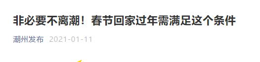 1月10日,潮州市新型冠状病毒肺炎疫情防控指挥部办公室发出《关于春节期间新冠肺炎疫情防控的倡议书》,呼吁广大市民非必要不离潮,特别是要认真做好主动登记报备、严控聚集活动、避免人群聚集、加强自我防护等八项工作,避免前往中高风险地区所在城市或出境旅游。
