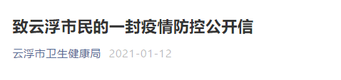 1月9日,云浮市新冠肺炎疫情防控指挥部办公室发布《致全市人民的一封信》,呼吁市民朋友坚持非必要不返乡、非必要不外出、非必要不聚集、规范处理冷链物品、坚持日常健康生活方式和做好身体健康监测。