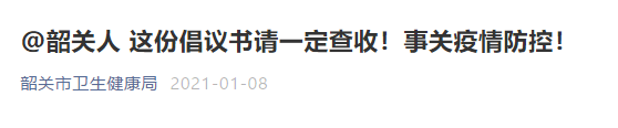 1月6日,韶关市新型冠状病毒肺炎疫情防控指挥部办公室发布《韶关市春节期间疫情防控倡议书》,明确加强监管场所、社会福利和养老机构、学校和托幼机构、旅游景点、影剧院、KTV等重点场所常态化疫情防控。