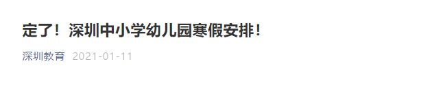 日前,深圳市教育局官宣了深圳中小学幼儿园寒假安排,其中还提到,市、区教育行政部门和学校(幼儿园)领导要带头在深过节,非必要不离深,严禁前往中、高风险地区;确需离深的,按程序报批。学校(幼儿园)教职员工和学生原则上留深,确有必要离深的,须提前向所在学校(幼儿园)报告。