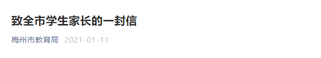 1月11日,梅州市教育局《致全市学生家长的一封信》,信中建议家长减少跨市出行,尽量跟孩子在梅州度过寒假,春节期间减少串门、聚餐,做到生活轨迹相对固定。确需跨市出行,请妥善做好个人防护,并如实向学校班主任报备去向及起止时间,切勿漏报瞒报。不出境,不前往中、高风险地区。