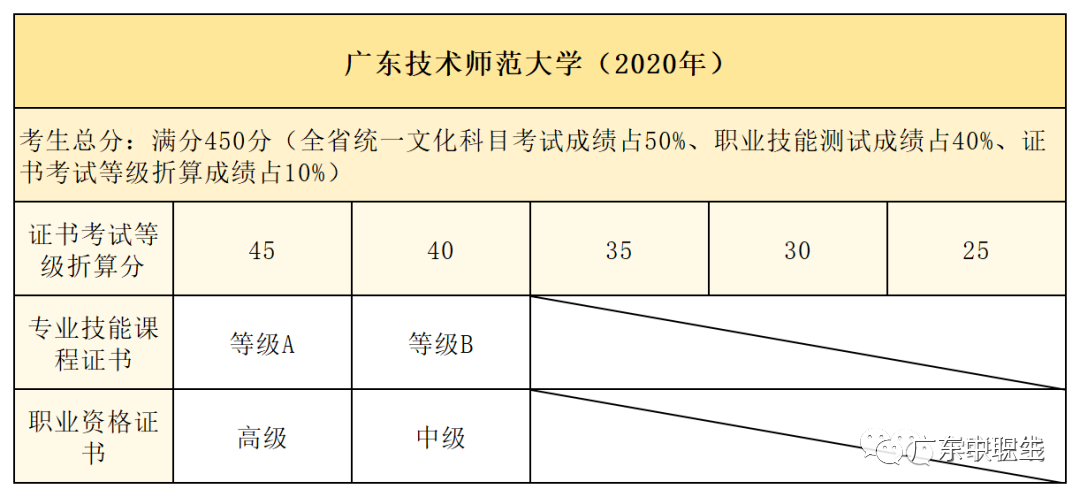 证书折算分占比10%,不同的院校有不同的折算方式,而且有的职业技能证书是没有折算分的,比如广东技术师范大学,专业课程技能证书只有A或B级才有折算分。