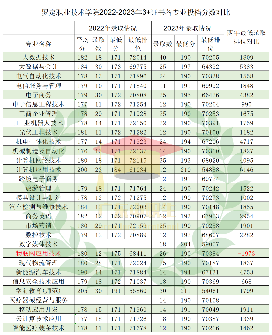 ◆ 2023年“3+证书”共30个专业招生,与2022年相比,2023年绝大多数专业的最低录取排位上涨,仅1个专业排位下降,是物联网应用技术,下降了1973名。涨幅最明显的是计算机应用技术,上涨了6146名。