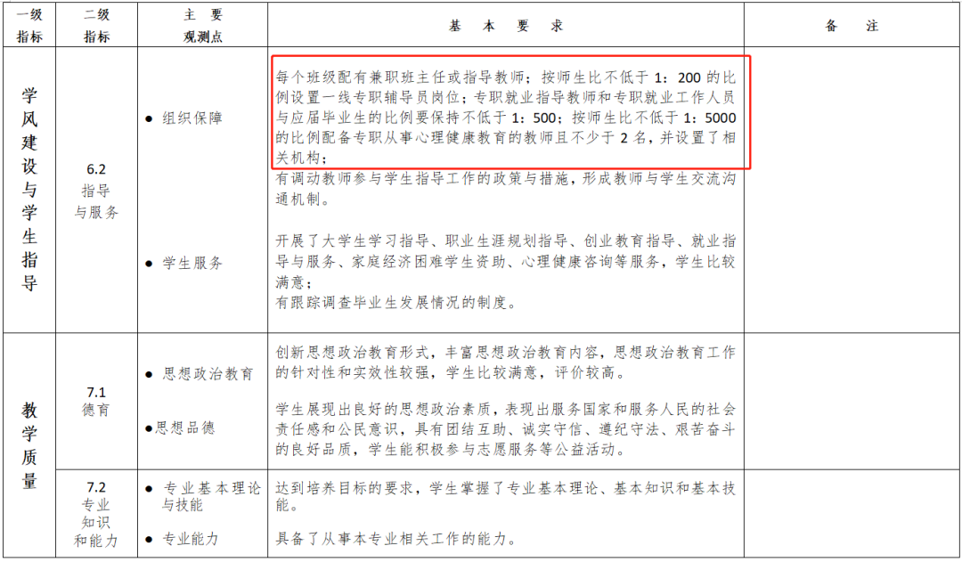 每个班级配有兼职班主任或指导教师;按师生比不低于1:200的比例设置一线专职辅导员岗位;专职就业指导教师和专职就业工作人员与应届毕业生的比例要保持不低于1:500;按师生比不低于1:5000的比例配备专职从事心理健康教育的教师且不少于2名,并设置了相关机构;