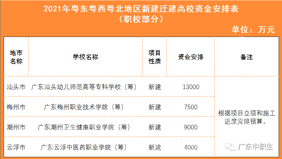 聚焦职教从广东省教育厅获悉,根据广东省省级财政专项资金管理要求,现将2021年粤东粤西粤北地区新建迁建高校资金共77300万元的安排方案(含项目总体绩效目标)予以公示。