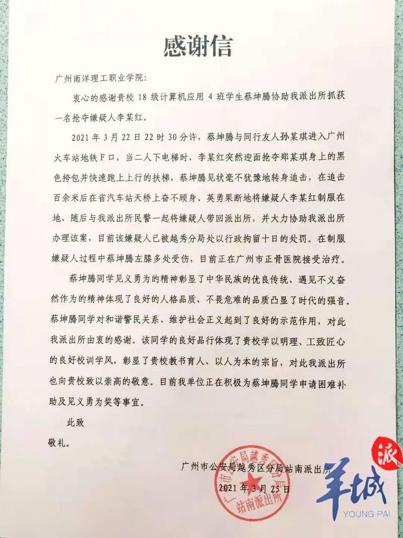 一封来自越秀区分局站南派出所的感谢信也到了校方手中——蔡坤腾同学见义勇为的精神彰显了中华民族的优良传统,遇见不义奋然作为的精神体现了良好的人格品质,不畏艰难的品质凸显了时代的强音。蔡坤腾同学对和谐警民关系、维护社会正义起到了较好的示范作用……