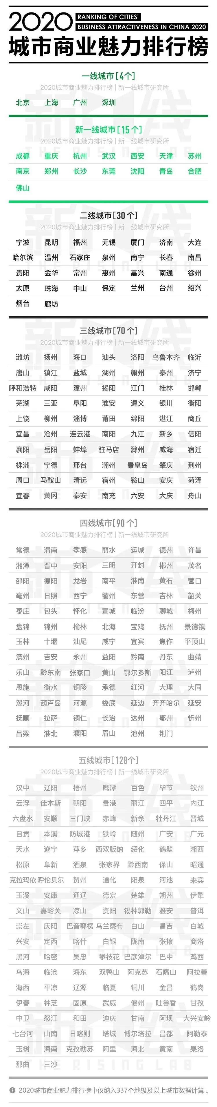 新一线城市(15个):成都、杭州、重庆、武汉、苏州、西安、天津、南京、郑州、长沙、沈阳、青岛、 东莞、佛山、合肥