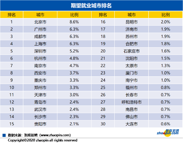 中国人民大学中国就业研究所与智联招聘的调研结果《2020年大学生就业力报告》显示,一线、新一线城市以及部分省会城市成为毕业生首要选择。具体来看,期望去北京、广州、成都、上海、深圳、杭州、南京、西安、重庆、郑州等城市就业的学生比例最高。
