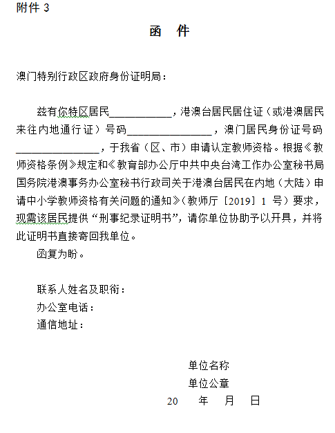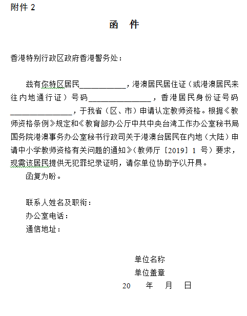 (2)港澳台居民申请认定中小学教师资格需提供无犯罪记录证明。无犯罪记录证明由申请人自行到香港特别行政区、澳门特别行政区和台湾地区的有关部门开具,具体的办理程序请咨询当地相关部门。香港特别行政区、澳门特别行政区申请人开具无犯罪记录证明所需的《无犯罪记录证明函件》,由申请人填写后交给现场确认点,待省级机构填写盖章完毕后,通知申请人到认定机构领取。港澳申请人的有无犯罪情况经港澳相关部门核查后,核查结果会反馈到出具函件的省级机构,省级机构再将核查结论通知有关教育局作为认定依据。台湾地区的申请人的无犯罪证明,由申请人自行到台湾地区相关部门开具,开好的无犯罪证明直接交给申请认定的认定机构。
