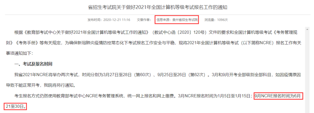 2021年9月份(第62次)全国计算机等级考试将于9月25-27日进行,截止发文之时,贵州省率先公布了报名时间。如下图: