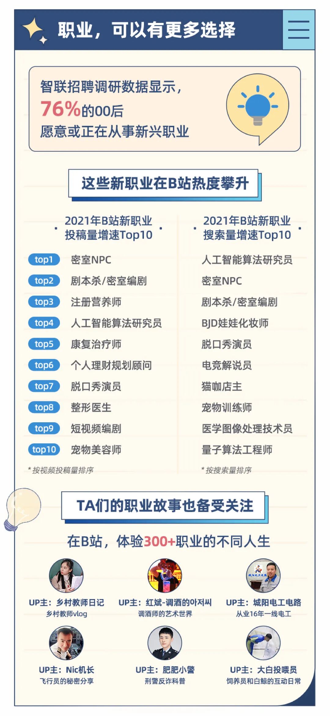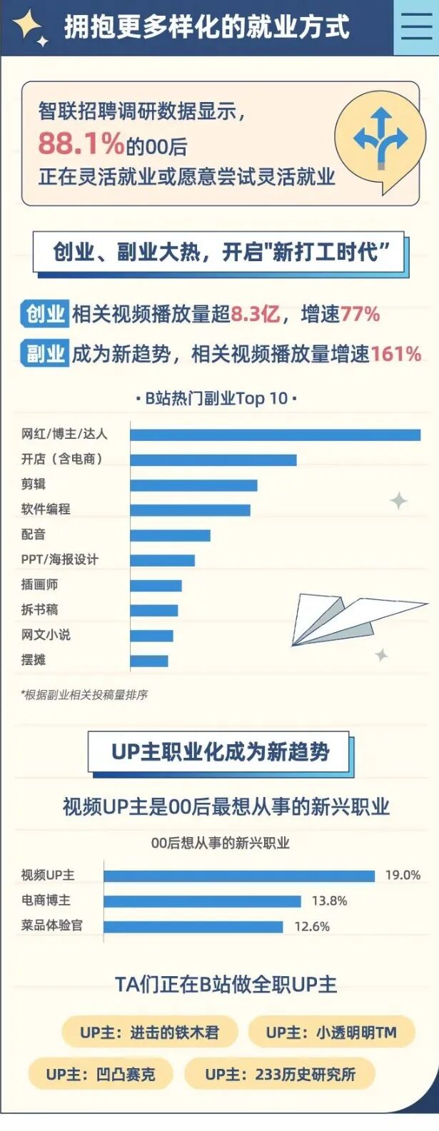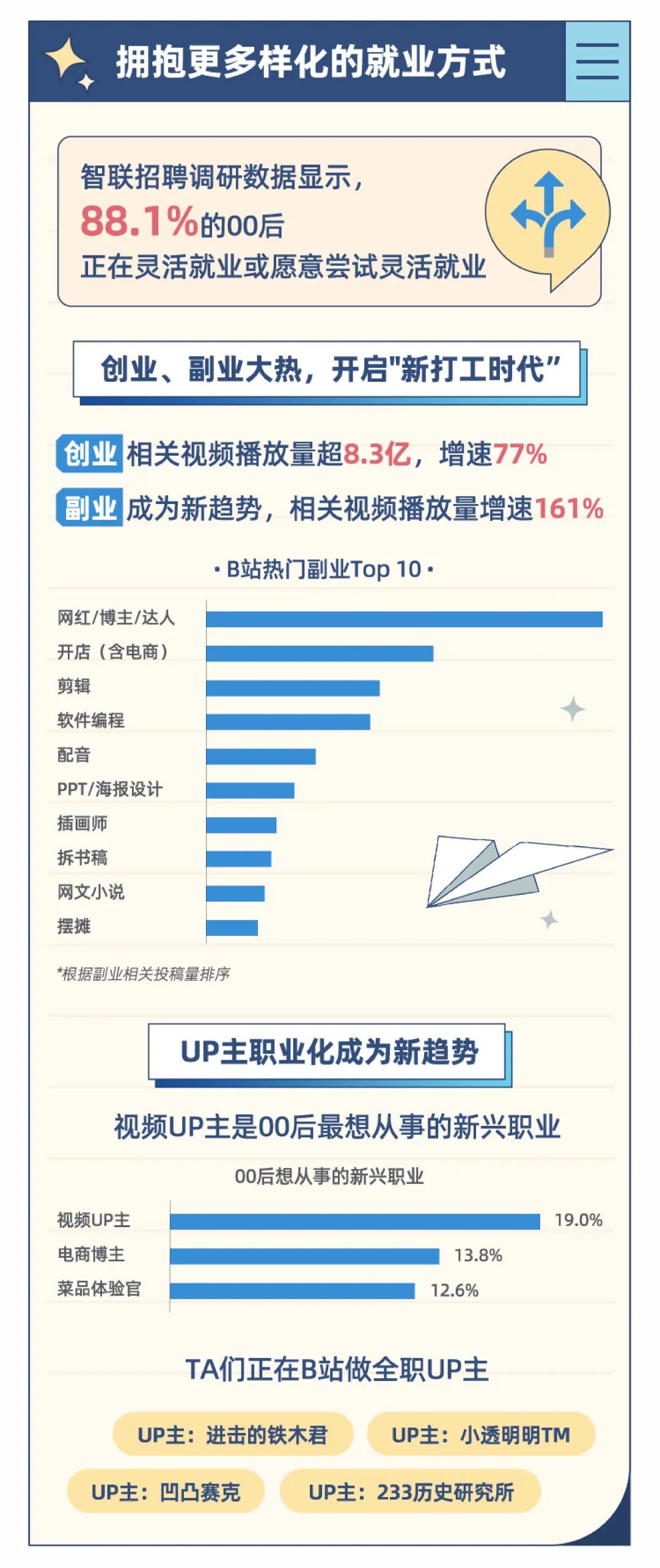 近日,智联招聘与哔哩哔哩联合发布《2022青年求职行为洞察报告》。其中,值得关注的是,随着短视频时代的热潮涌来,视频UP主也成为了00后最想从事的新兴职业。有想做视频up主的同学吗?(完整版报告见文末)