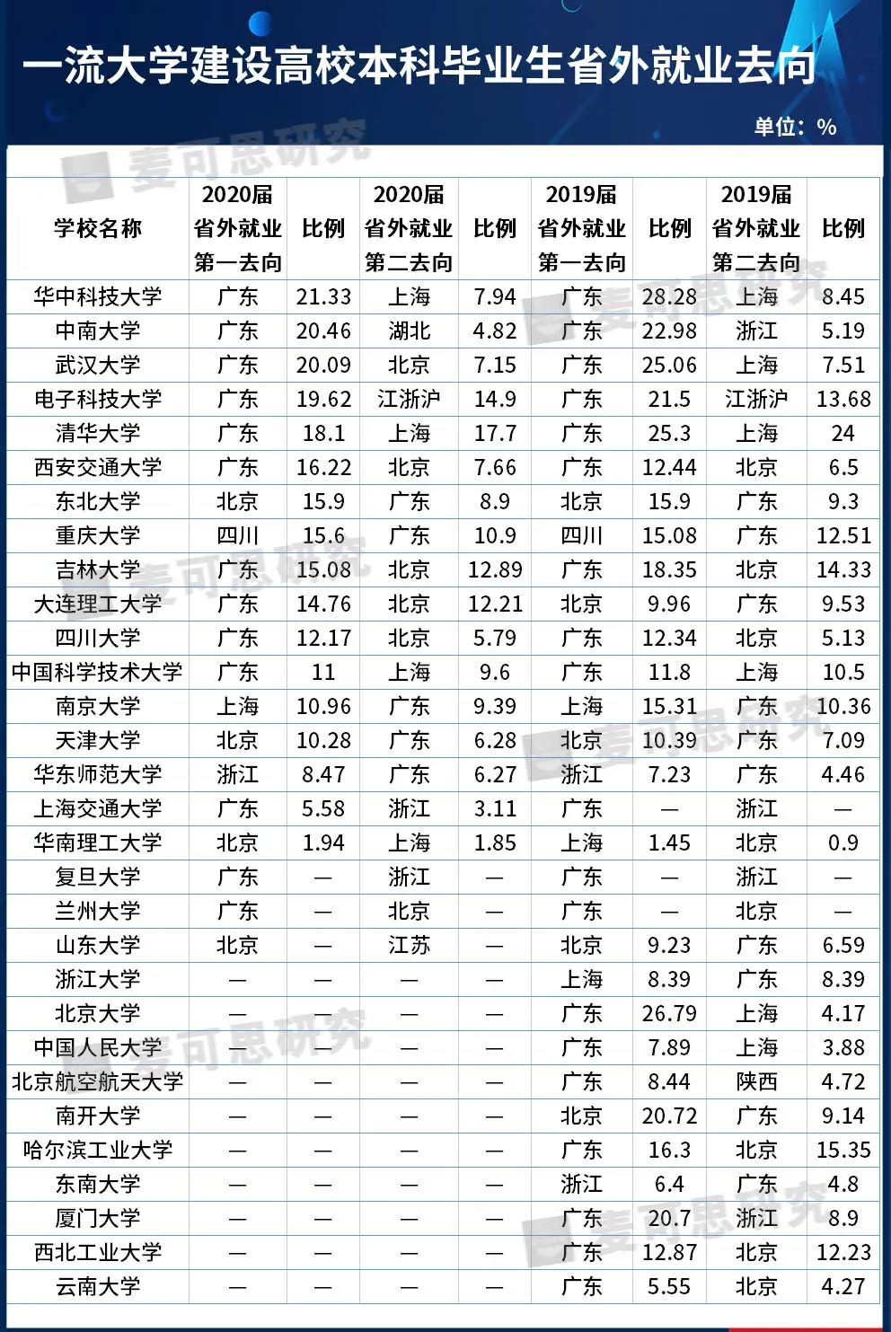 据麦可思研究统计发现,13所一流大学建设高校2020届毕业生就业时的省外第一去向是广东,4所大学的省外第一去向是北京;6所高校的省外第二去向是北京,5所高校的省外第二去向是广东,4所高校的省外第二去向是上海。此外,四川、浙江、湖北、江苏等也是毕业生的就业流向地。