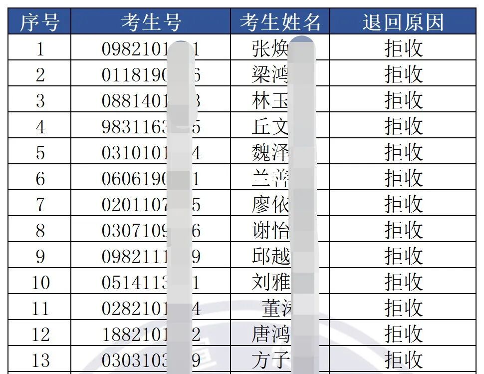 由于录取通知书邮寄地址不详细、无人接听、关机或拒收等原因,下列同学的录取通知书快递被退回我校。
