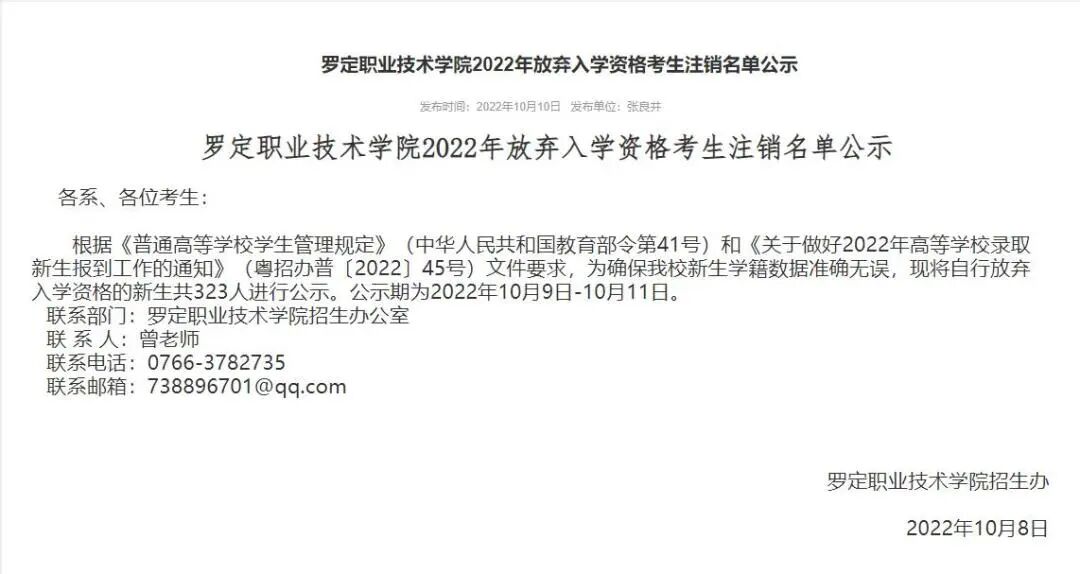 除了茂名幼儿师范专科学院外,还要罗定职业技术学院。据官方网站公布,2022年有323名新生放弃入学资格。