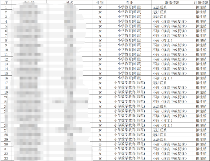 从拟注销入学资格的新生名单来看,热门的专业还挺多的:如小学教育(师范)、小学数学教育(师范)等。而放弃入学资格的学生除了无法联系以外主要是选择“复读”,还有个别学生可能选择了“打工”!
