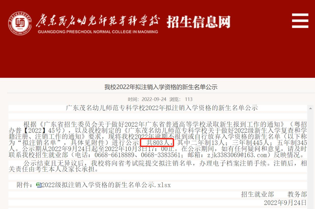 此前,广东茂名幼儿师范专科学校公布了2022年拟注销入学资格的新生名单。该校今年共有803名新生放弃入学资格,放弃入学人数有点离谱啊!