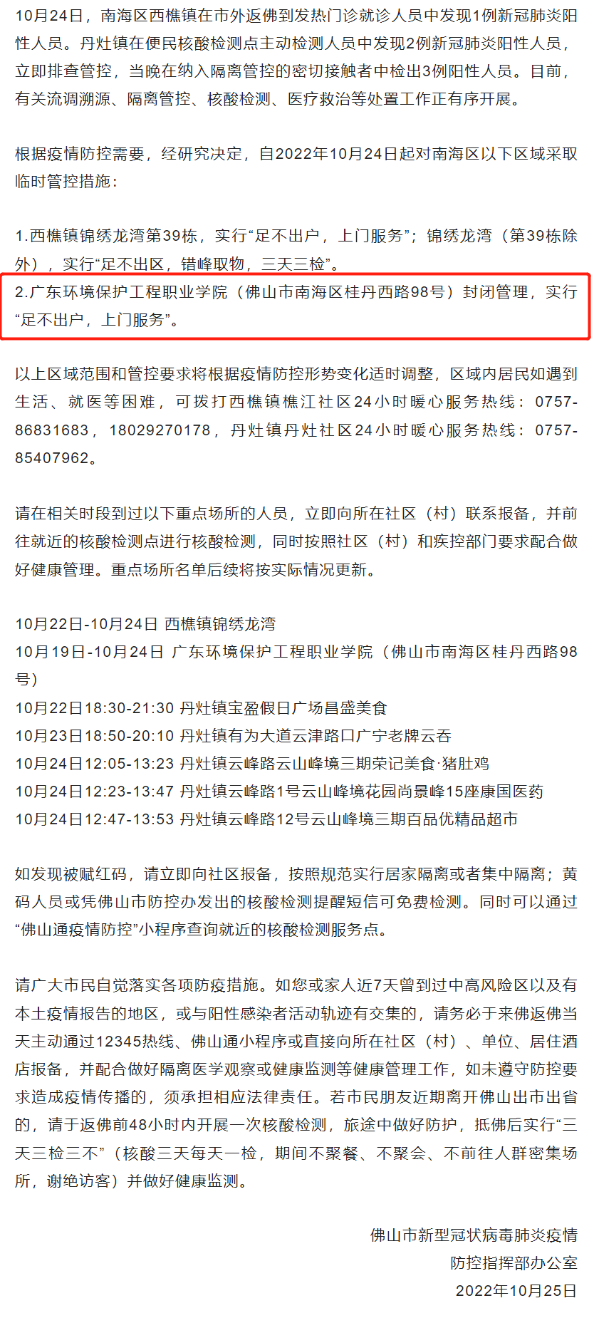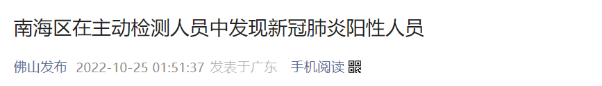 10月25日凌晨,据佛山发布消息,南海区报告6例新冠阳性人员。