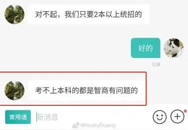 事件的起因是某公司的招聘人员在与求职者沟通时,称“考不上本科的都是智商有问题的”。随后该聊天记录被网友传开,并引起广泛讨论↓↓↓
