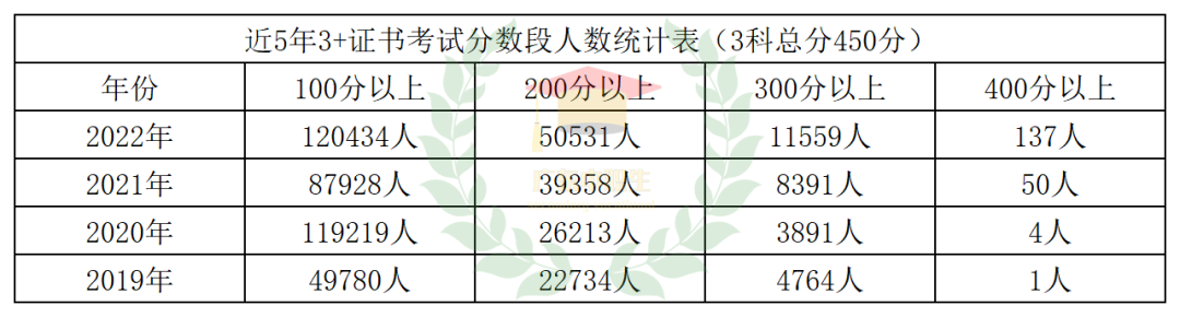 大撕兄对近四年的3+证书考试分数段人数做了个统计表:
