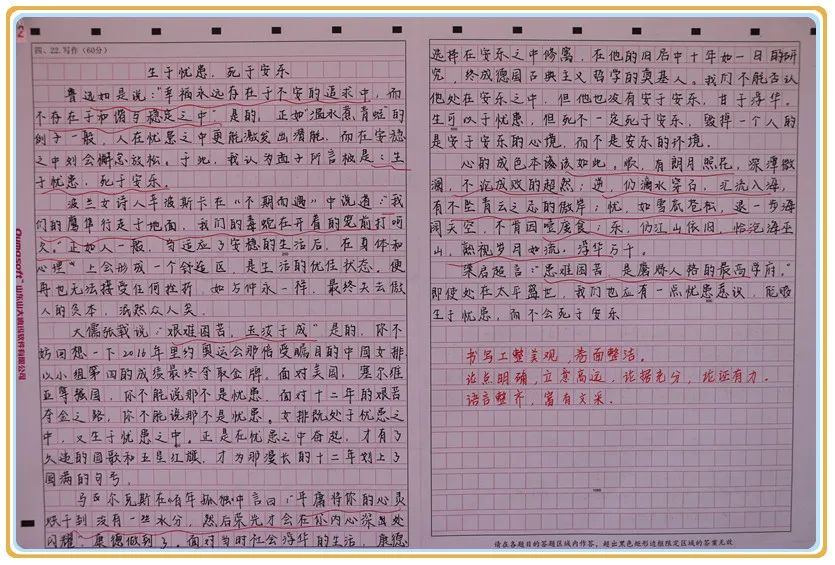 应对:书写差的学生应加强书法练习,不仅每个字要力争书写工整、大方,而且整个卷面要做到干净、清洁;答题卡答题范围设置是假定用三号字书写两倍正确答案字数的大小,考生无需担心字写大了书写空间不够;考试时统一要求学生使用配套的0.5mm考试专用水芯笔,避免笔迹过淡或过浓导致扫描不清晰。