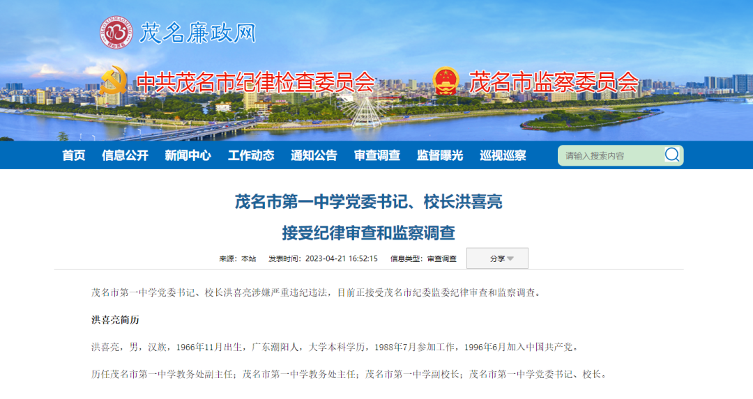 据茂名廉政网4月21日消息,广东茂名市第一中学党委书记、校长洪喜亮涉嫌严重违纪违法,目前正接受茂名市纪委监委纪律审查和监察调查。
