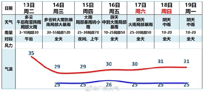 •13日夜间-14日:粤西、珠江三角洲和粤北市县有大雨到暴雨局部(特)大暴雨,其余市县有中雷雨局部大雨;由于近日天气够热,热力条件好,容易激发强对流,雷雨时局地伴有短时强降水和8级~10级大风。