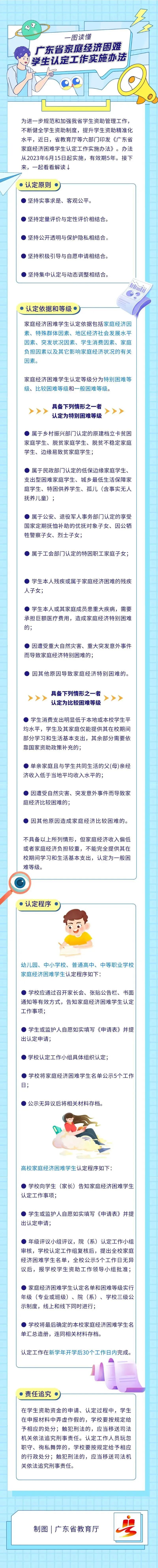 为进一步规范和加强我省学生资助管理工作,不断健全学生资助制度,提升学生资助精准化水平,广东省教育厅、省财政厅、省民政厅、省人力资源社会保障厅、省乡村振兴局、省残疾人联合会印发了《广东省家庭经济困难学生认定工作实施办法》,明确了家庭经济困难学生认定原则、认定机构与职责、认定依据和等级、认定程序、责任与监督、法律责任等内容。办法从2023年6月15日起实施,有效期5年。