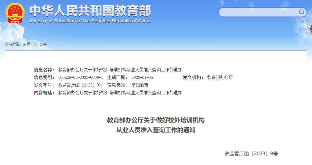 近日,在前期试点基础上,教育部办公厅印发《关于做好校外培训机构从业人员准入查询工作的通知》,全面推行校外培训机构从业人员准入查询制度,把好从业人员入口关。