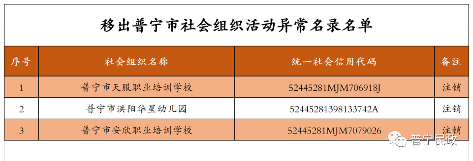 普宁市天服职业培训学校等3家社会组织因未按照规定时限和要求向登记管理机关报送2021年度工作报告,于2023年1月9日被列入活动异常名录。