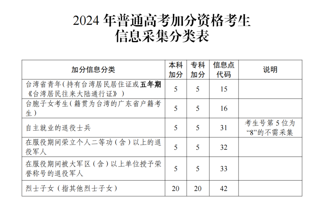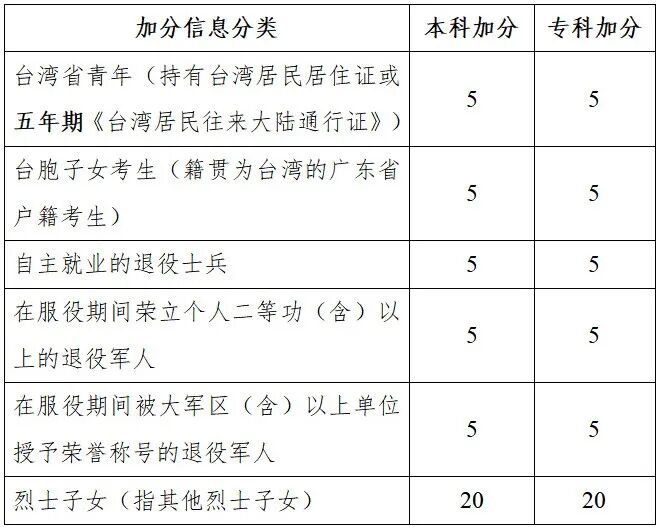根据广东省教育考试院公布的2024年普通高考加分资格考生信息采集分类表,烈士子女(指其他烈士子女)本科、专科都是加20分,其他类型加分则均为加5分。
