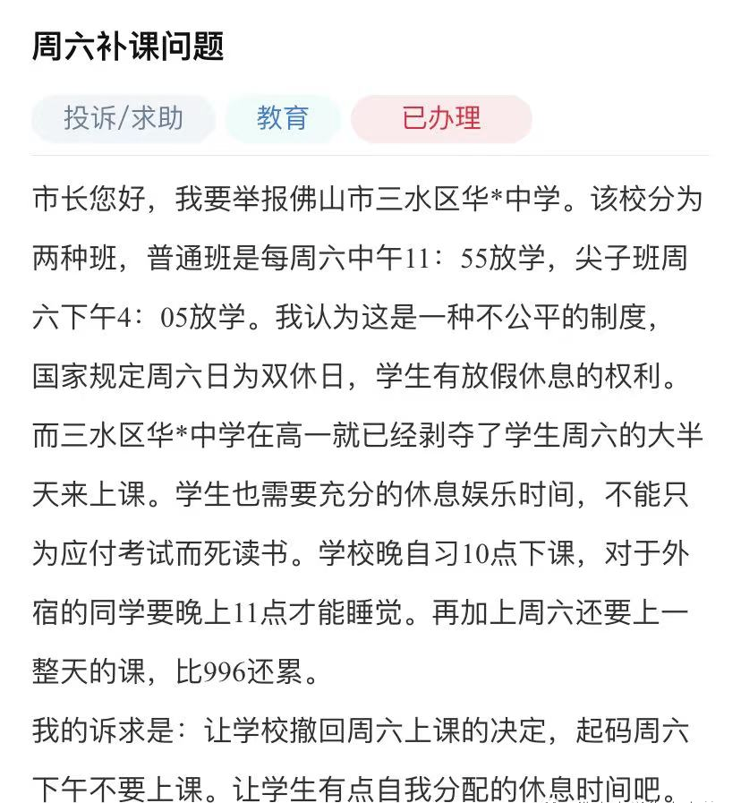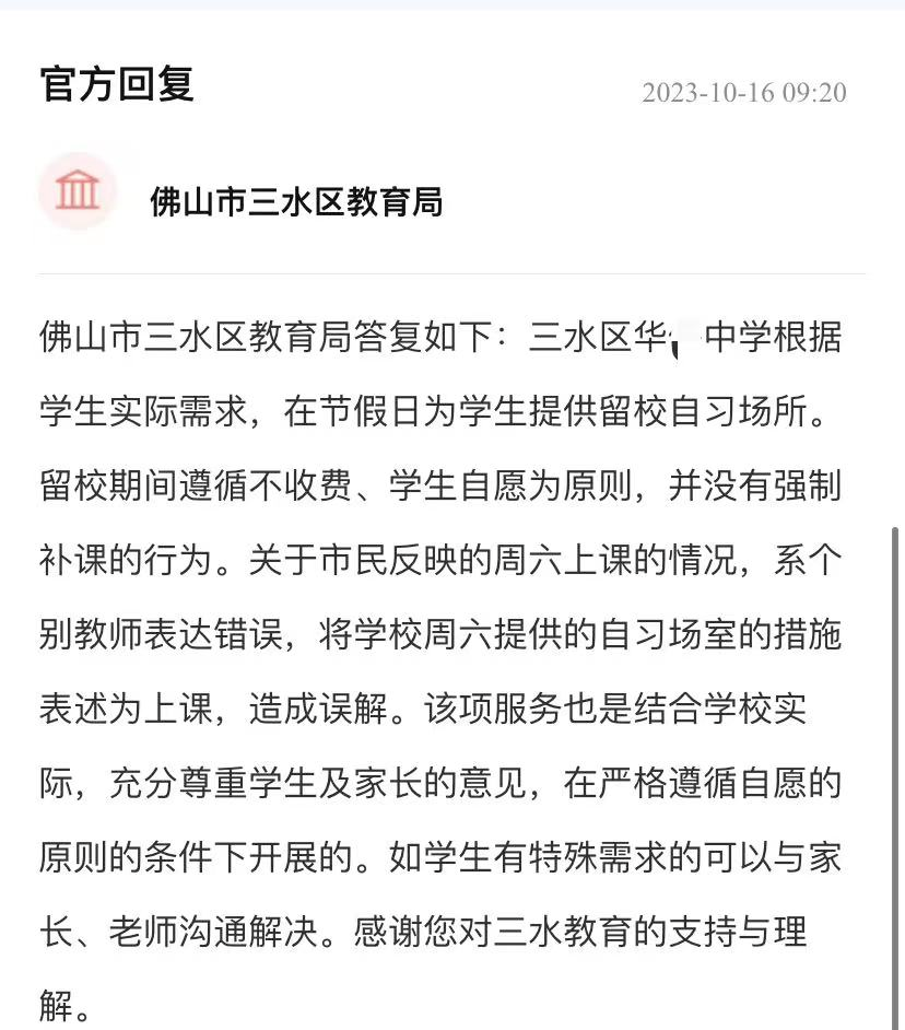 广东佛山一学生投诉学校周六还要上课,教育局回复了!