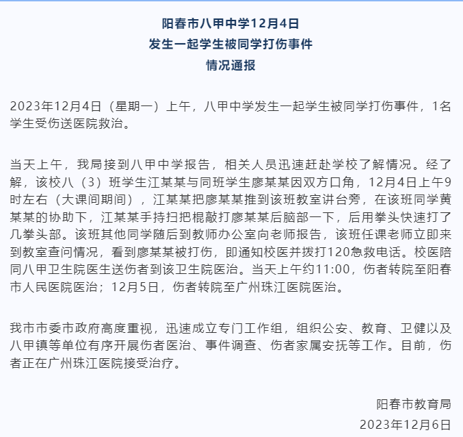 当天上午,我局接到八甲中学报告,相关人员迅速赶赴学校了解情况。经了解,该校八(3)班学生江某某与同班学生廖某某因双方口角,12月4日上午9时左右(大课间期间),江某某把廖某某推到该班教室讲台旁,在该班同学黄某某的协助下,江某某手持扫把棍敲打廖某某后脑部一下,后用拳头快速打了几拳头部。该班其他同学随后到教师办公室向老师报告,该班任课老师立即来到教室查问情况,看到廖某某被打伤,即通知校医并拨打120急救电话。校医陪同八甲卫生院医生送伤者到该卫生院医治。当天上午约11:00,伤者转院至阳春市人民医院医治;12月5日,伤者转院至广州珠江医院医治。