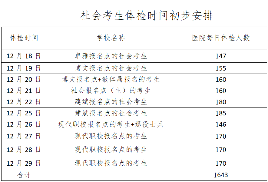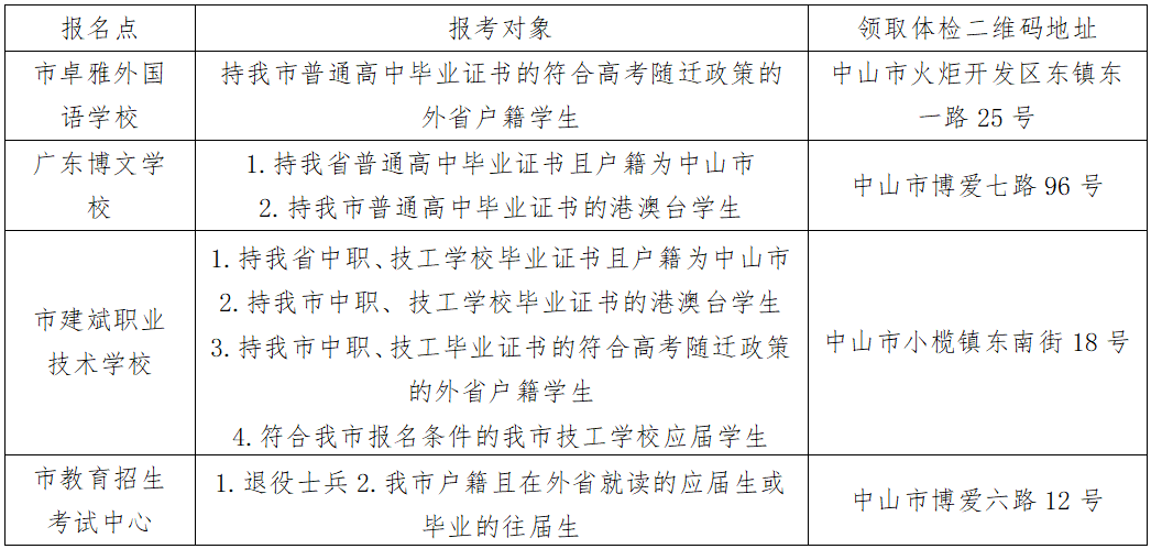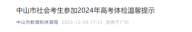 一、中山市2024年高考体检工作12月18日开始进行,我市社会考生体检安排在中山市人民医院健康管理分中心(中山市骨科医院:中山市南区茶亭路163号)进行,体检时间: 12月18日至12月29日(8:00-10:30,节假日休息),考生须完成体检预约和缴费才能参加体检,考生体检须携带身份证和高考体检二维码。