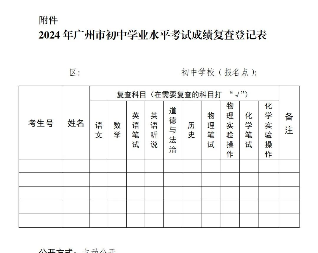 附件:2024年广州市初中学业水平考试成绩复查登记表