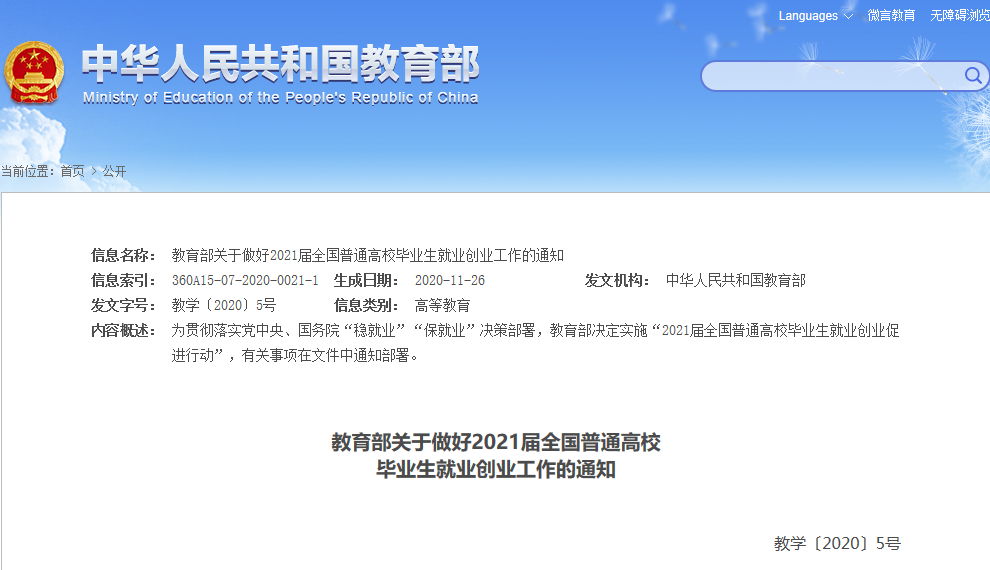 近日,教育部发布《关于做好2021届全国普通高校毕业生就业创业工作的通知》。通知指出,树立正确用人导向。推动党政机关、事业单位、国有企 ...