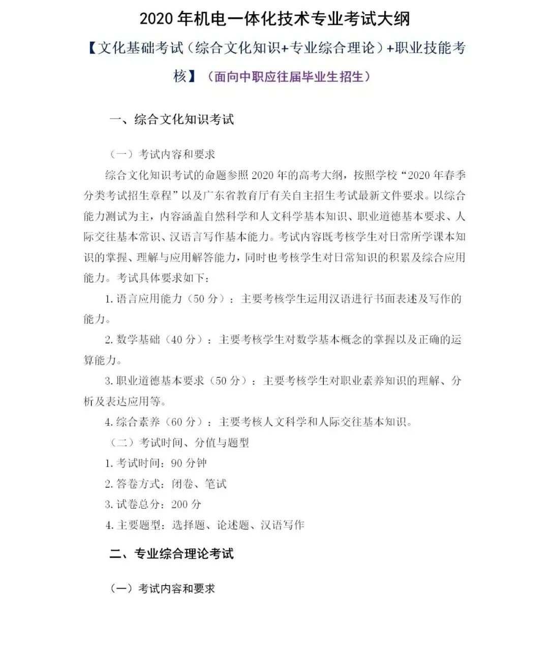 2020年机电一体化技术专业考试大纲
