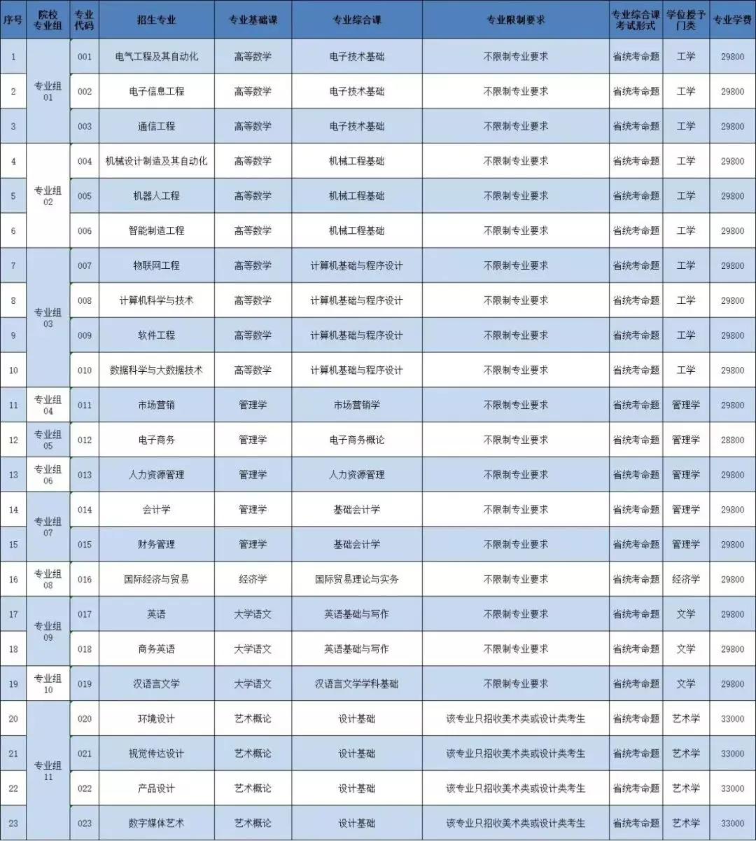 注:专业组01和02是普通批,03和04是建档立卡批。以上信息仅供参考,最终招生专业、招生计划、收费标准及相关说明待教育主管部门下达招生计划后另行公布。前置专业最终以报名系统为准。