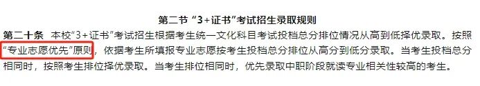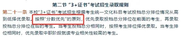 录取规则:比如3+证书的录取原则(分数或志愿优先),有无加试要求、对加分或降低分数要求投档、投档成绩相同考生的处理、进档考生的专业安排办法等)。