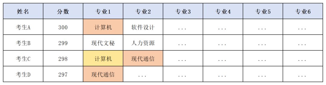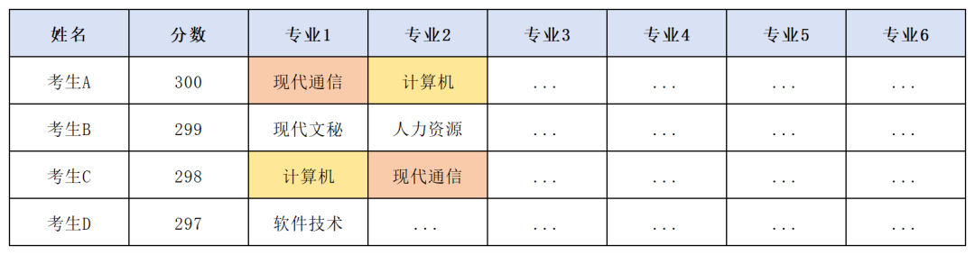 例如:某高校计算机专业招收1人,现代通信招生2人,考生A虽然分数最高,但第一志愿专业不是计算机,计算机专业优先录取考生C,考生A只能等待高校进行第二次检索。