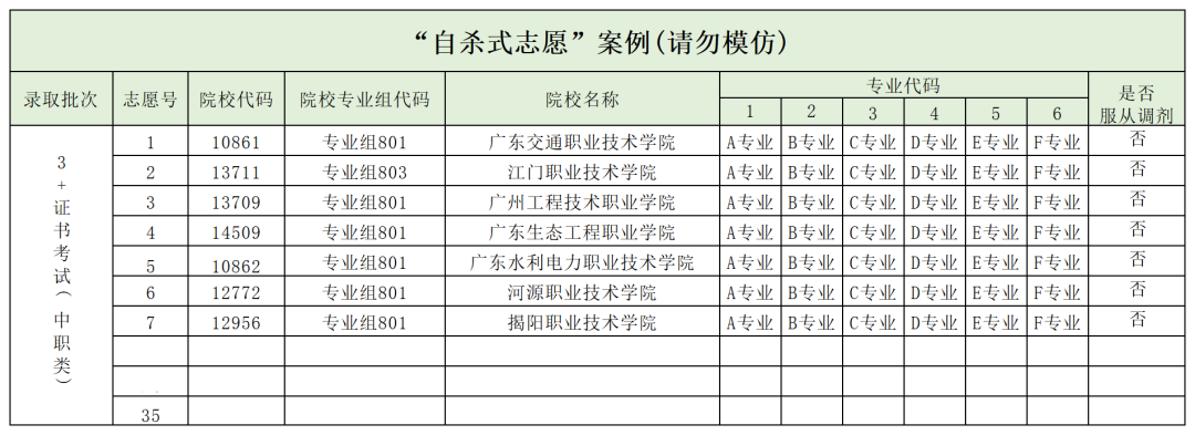 每年填志愿的时候,总有一些心高气傲的考生,非某院校某专业不读,在志愿表上只填少量院校专业组,且不服从调剂!明明有35个院校专业组可报,最后只填一两个专业组,这样是很容易滑档的。