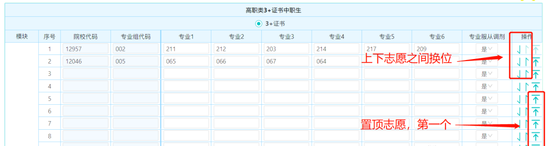 专科组输入院校代码、专业组代码和专业代码填报,一共可以填35个院校专业组,可以不填满。