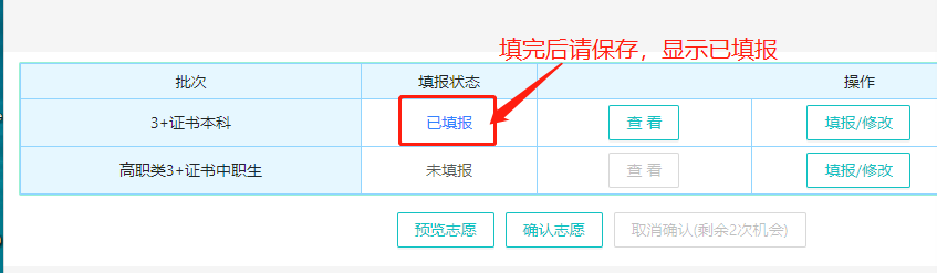 点击保存志愿,填报状态从【未填报】中改为【已填报】。