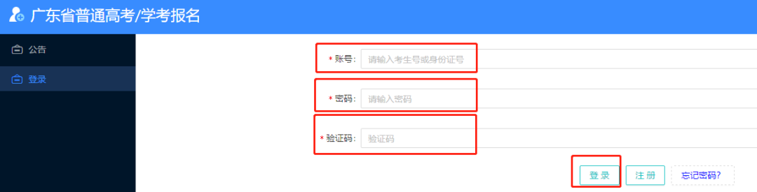 选择“登录”,输入考生号、密码和验证码(图形验证码)。