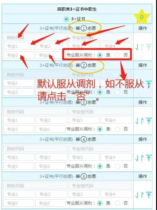 现在志愿是默认服从的!表的右边可以很容易调换志愿之间的位置!