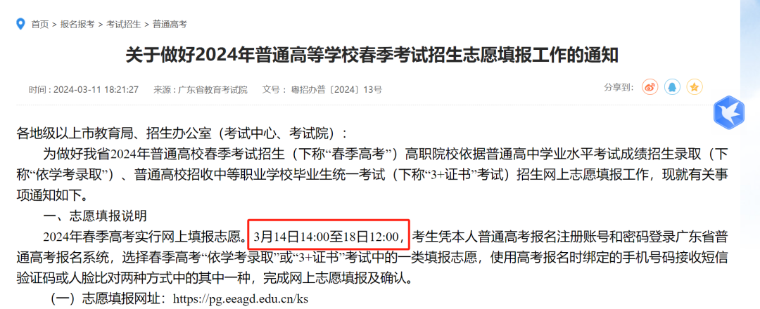 2024年春季高考志愿填报时间为3月14日14:00-18日12:00!今天下午2点就开始填报志愿了!