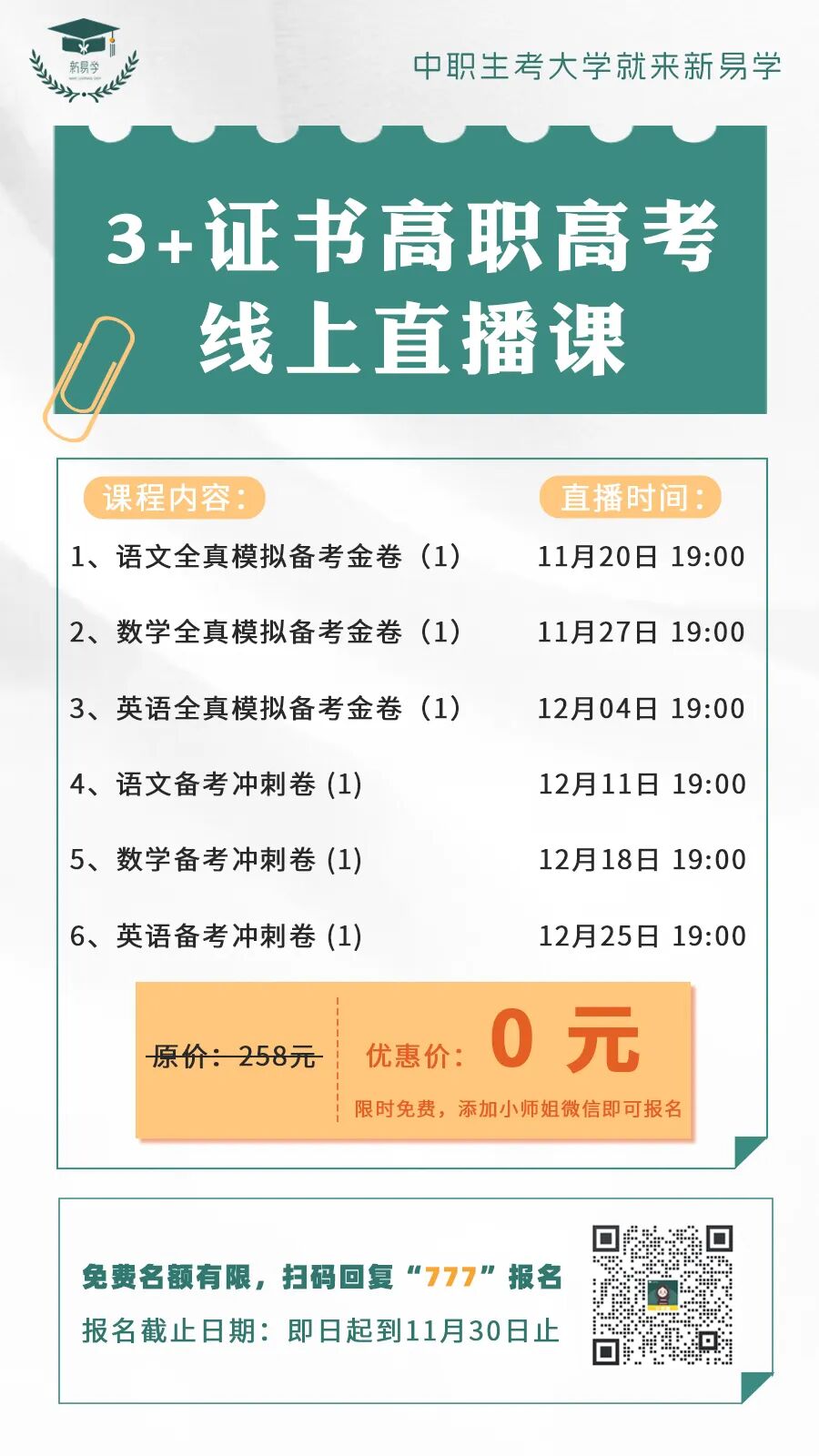 模拟卷和冲刺卷的公益直播课有六期,时间为每周一晚上的19:00(有改期会提前通知大家)。大家可先进群,第一时间获取试题以及直播最新消息。
