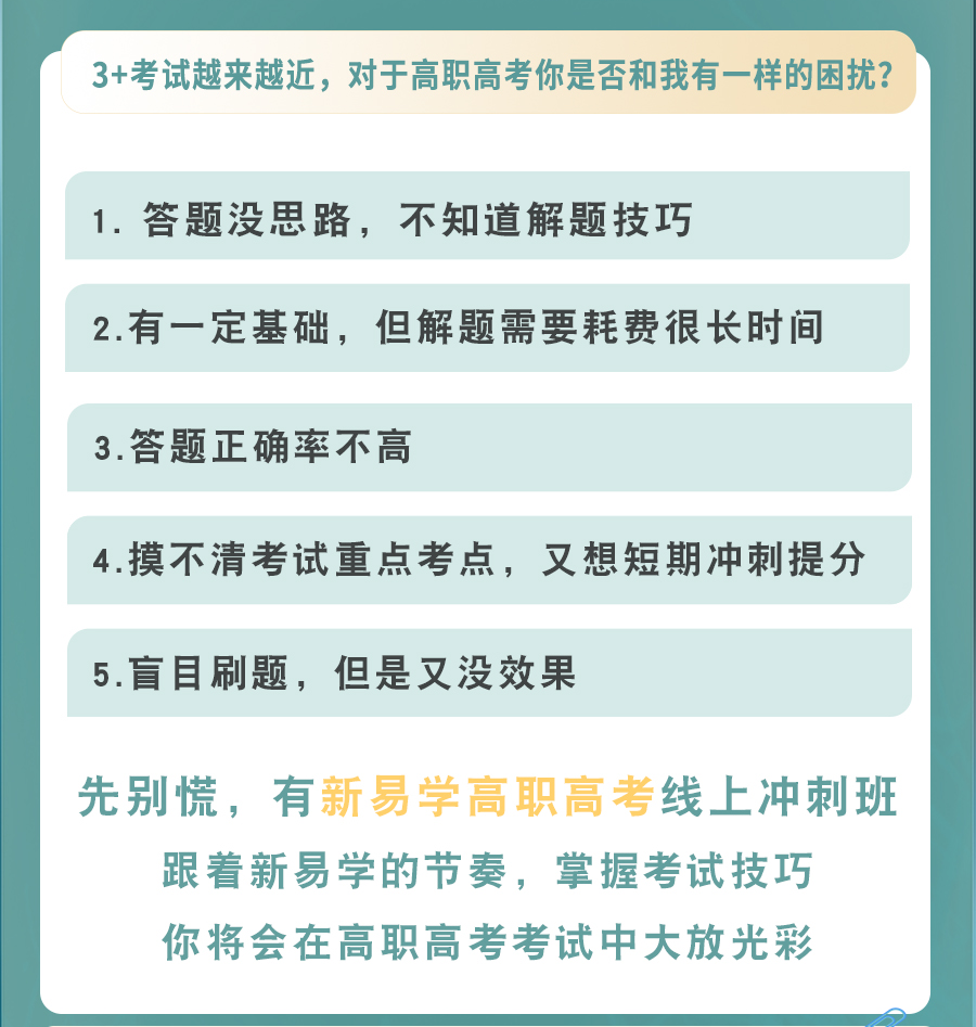 2023年新易学的模拟卷成功押中了高职高考的英语作文题和54%的数学真题。市面上有许多押题卷,如果盲目去刷题看讲解,考试还考不到,白白浪费宝贵的复习时间。